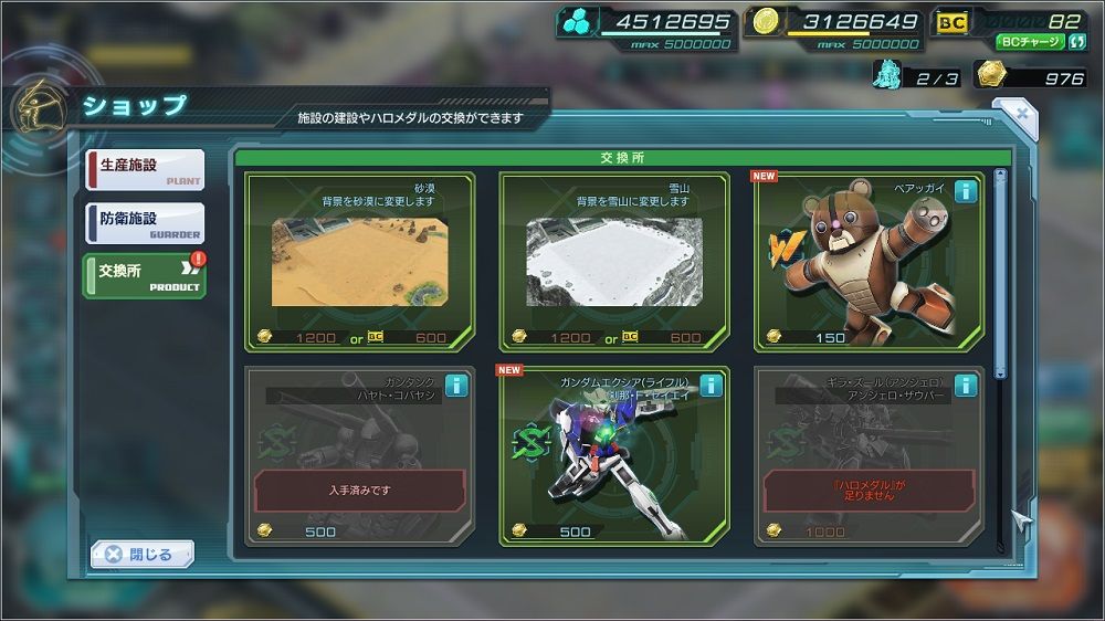 本日のアップデートで ハロメダル交換機体にベアッガイとエクシアSが追加
