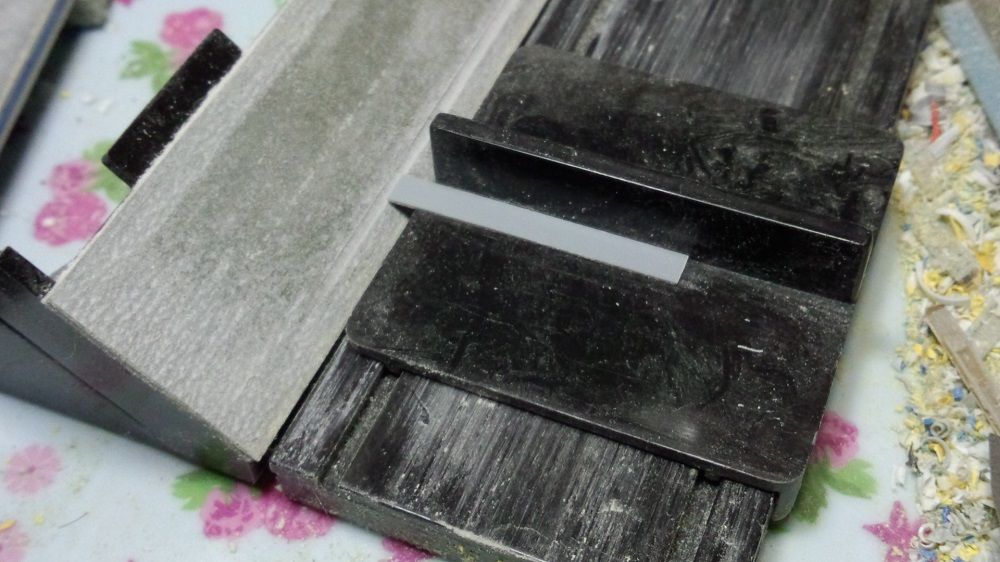 ヤスリほう台で プラ版(0.5mm)の両端を45度に削り