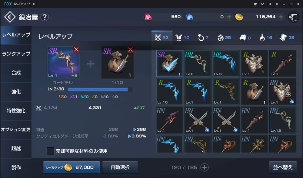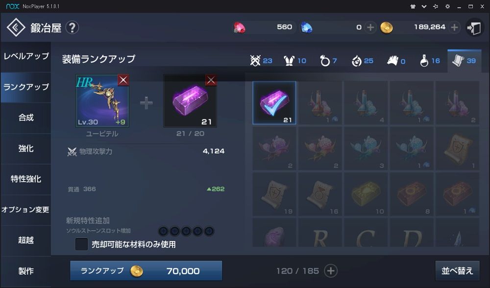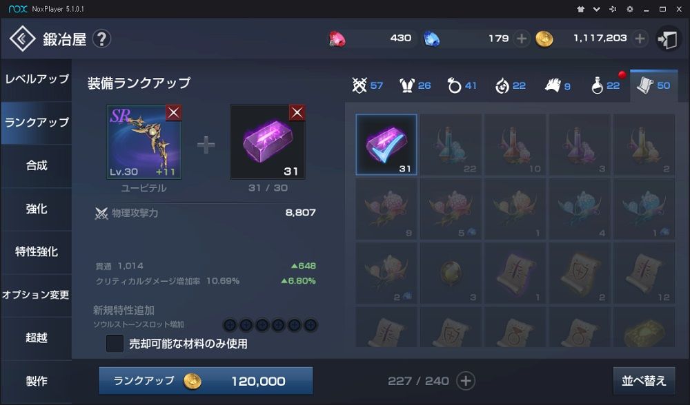 鍛冶の中に レベルアップ ランクアップ 合成 強化 特性強化 オプション変更 超越